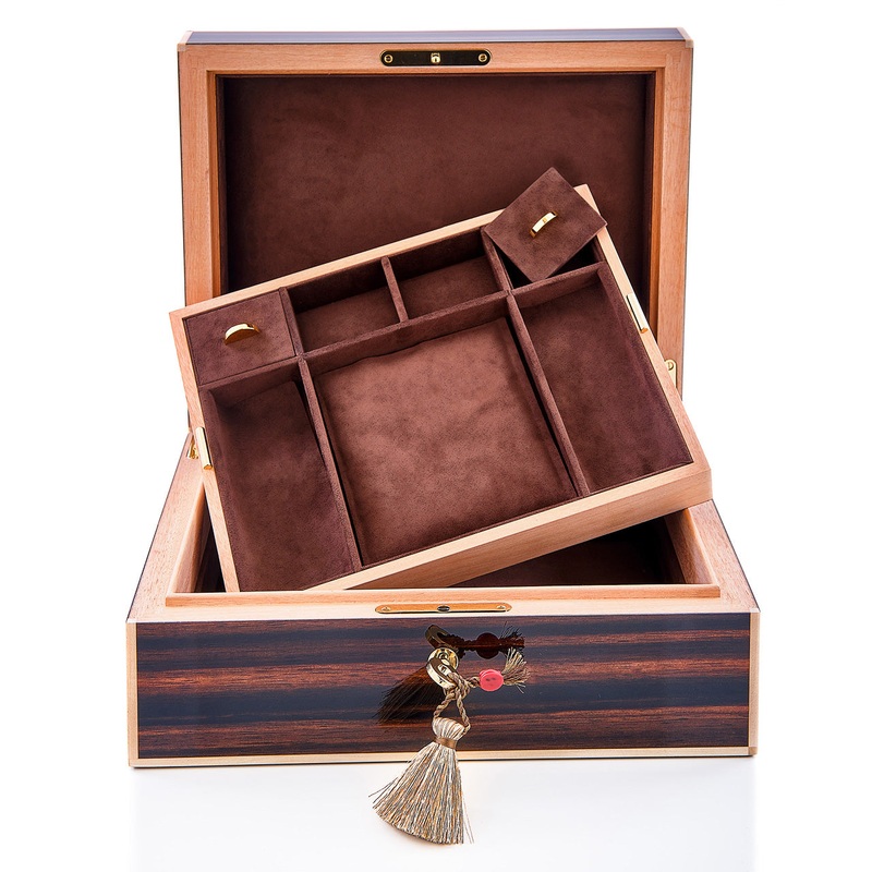 Leanschi Watch Case Macassar Ebony And Ivory LEAN-EB02. A gorgeous and prestigious jewelley-box made out of finest macassar ebony veneer. With removable upper-tray and solft chocolate Alcantara interior.