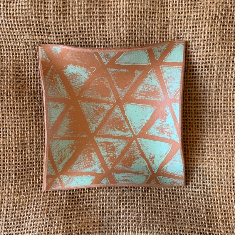 Hand Shaped Trays are made by hand with no other shaping device. 8/9oz vegetable tanned leather and water only are used to create these pieces. Block printing is done by hand in-house as well. As always, each piece is finished with plant oils, beeswax and