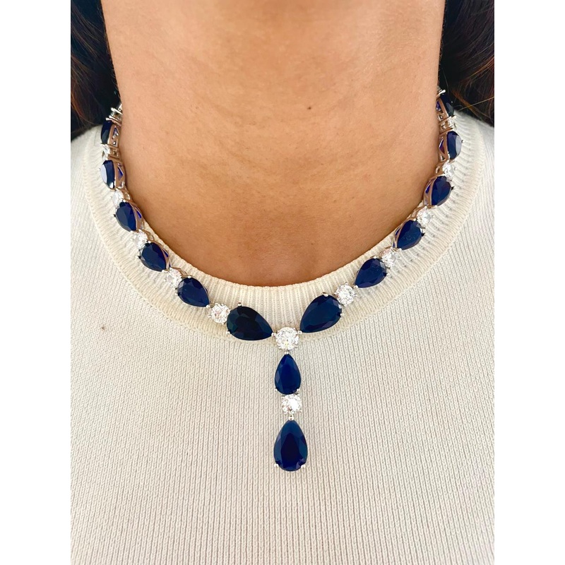 Ships quickly to New York, London, Dubai, Riyadh, Kuwait City, and Doha. Shine with timeless beauty wearing the Lenti Tear Drop Sapphire Diamond Necklace Setwhere classic design meets radiant charm.