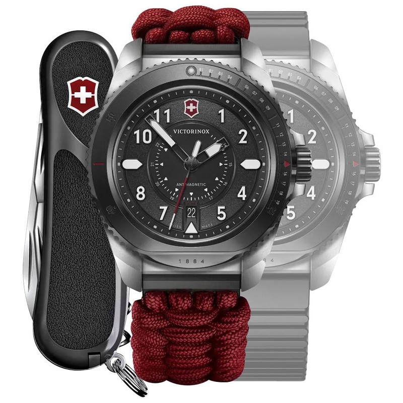 Victorinox Swiss Army Journey 1884 Limited Edition Stainless Steel Black Dial Red Nylon Interchangeable Black Rubber Strap Date Divers Quartz Mens Watch Model# 242016.1 / V242016.1