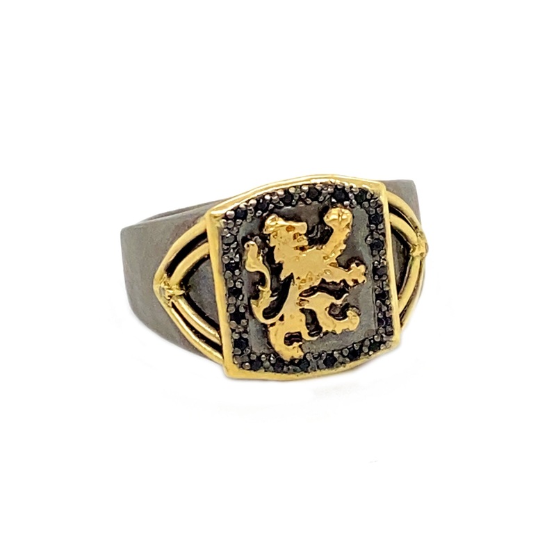 18k Yellow Gold and Blackened Sterling Silver Lion Signet Ring With Black Sapphires and Champagne Diamonds. (.01 TCW)