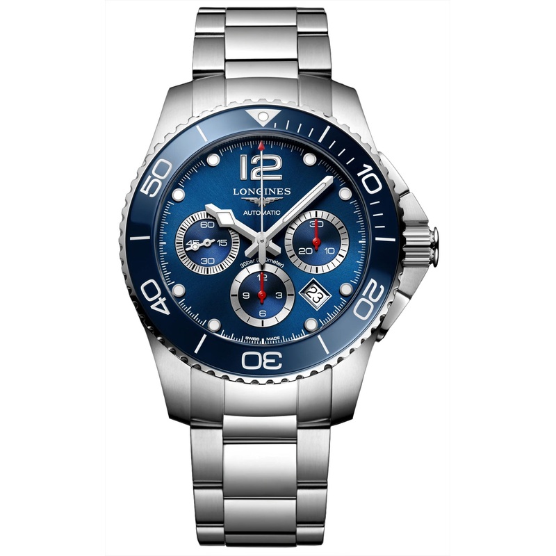 Longines HydroConquest Automatic Chronograph Stainless Steel Blue Dial Date Divers Mens Watch Model# L3.883.4.96.6 / L38834966 features a 43 mm stainless steel case that holds the blue sunray dial and a uni-directional rotating bezel with a matching blue c