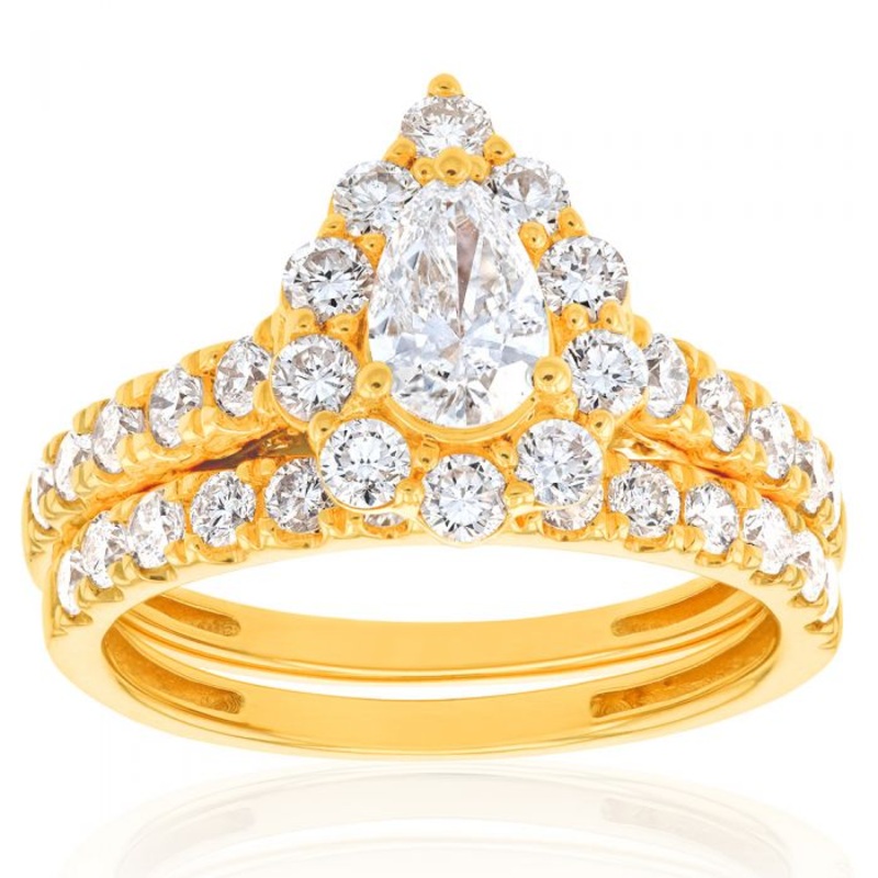 Illuminate your love story with our Luminesce Lab Grown Diamond 1.5Ct Bridal Set, featuring a dazzling pear-shaped centre diamond encircled by a captivating halo, all set in 14ct yellow gold. Each lab-grown diamond in this set is meticulously crafted with the utmost precision, harnessing the same brilliance and beauty as natural diamonds. The pear-shaped centre diamond exudes timeless elegance and is complemented by a halo of smaller diamonds that enhance its radiance. Set in lustrous 14ct yellow gold, this bridal set exudes warmth and sophistication.