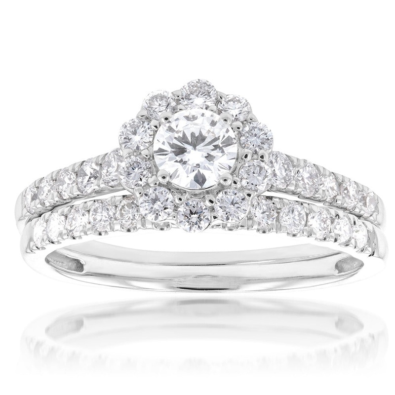 This brilliant bridal set features a luxurious 14 carat white build that has been set with a 1.5 carat Luminesce lab-grown diamond with a halo setting. It’s absolutely stunning to look at and catches the light at every angle. The shiny 14 carat white gold setting compliments the sparkly diamonds perfectly with its bright shimmer.
