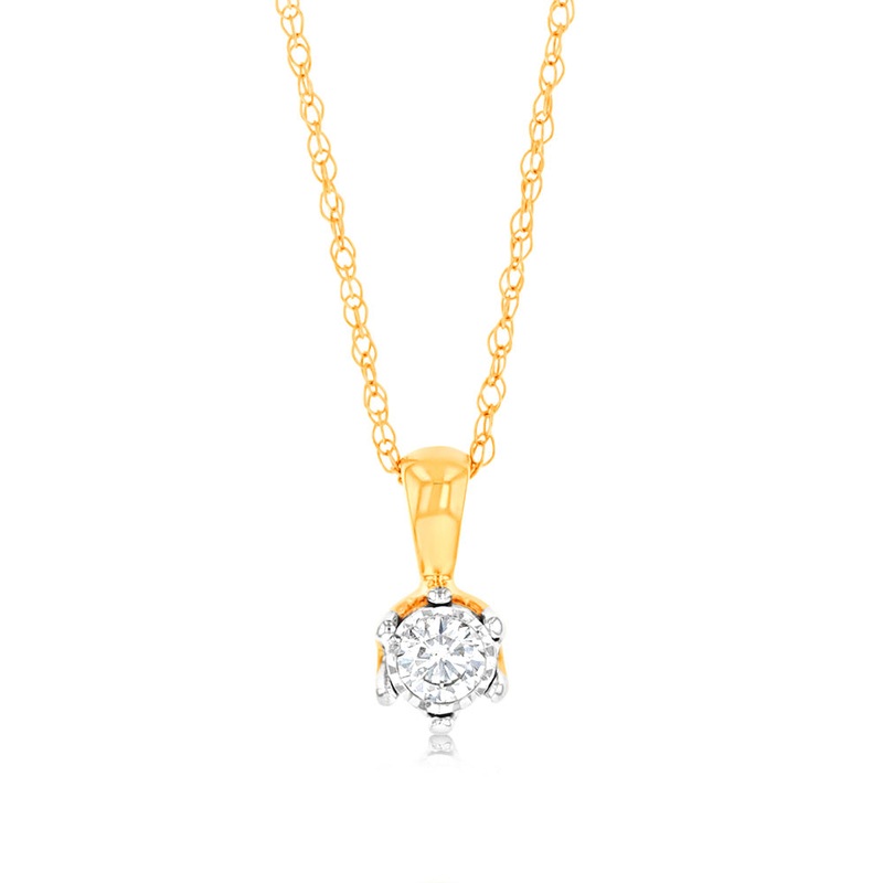 Draw the attention to your neck with this Luminesce Lab Grown Diamond 6 Claw Solitaire Pendant in 9ct Yellow Gold With Chain. With a stunning eco-friendly Luminesce lab grown diamond securely held by 6 claws on a yellow gold pendant base, this necklace is both classy and unique.