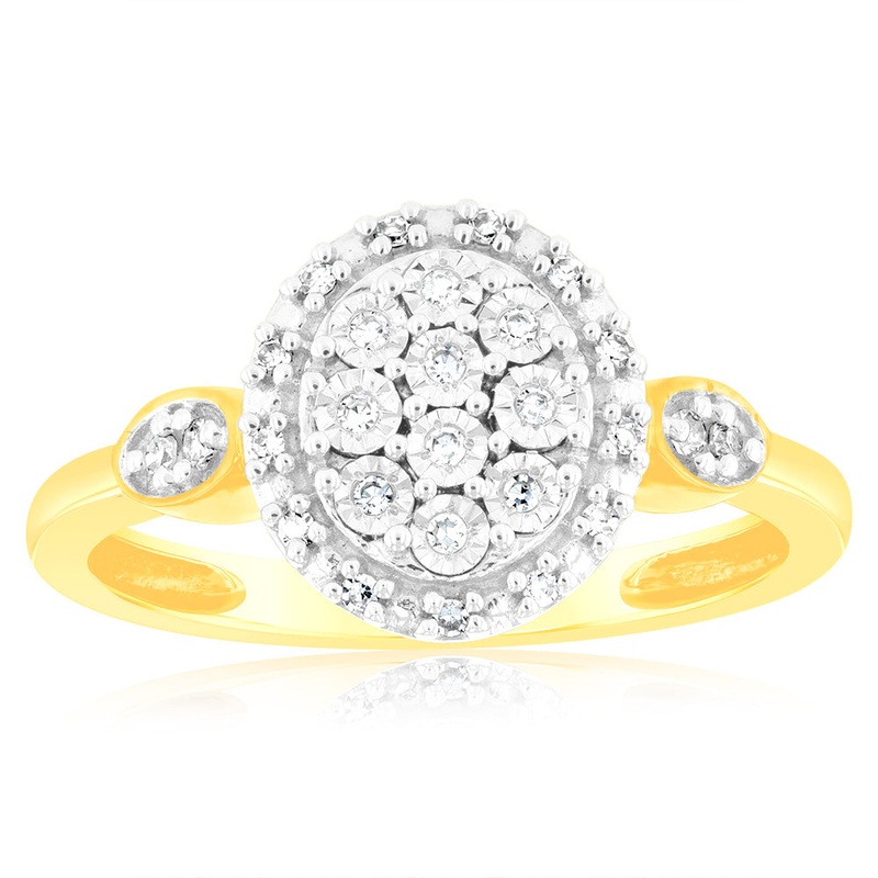 The Luminesce Lab Grown Oval Ring with 28 Diamonds Set in 9 Carat Yellow Gold is a remarkable expression of sophistication and responsible luxury. Crafted with meticulous precision, this exquisite ring features a captivating oval-shaped lab-grown diamond at its centre, securely nestled within a 9 carat yellow gold setting. Surrounding the centre stone are 28 dazzling diamonds that add a brilliant sparkle and allure to the piece. With a commitment to sustainability and ethical sourcing, Luminesce ensures that every diamond is lab-grown, offering a guilt-free indulgence in fine jewellery. Immerse yourself in the timeless elegance and conscious beauty of the Luminesce Lab Grown Oval Ring, and let its radiance enhance your style and grace.
