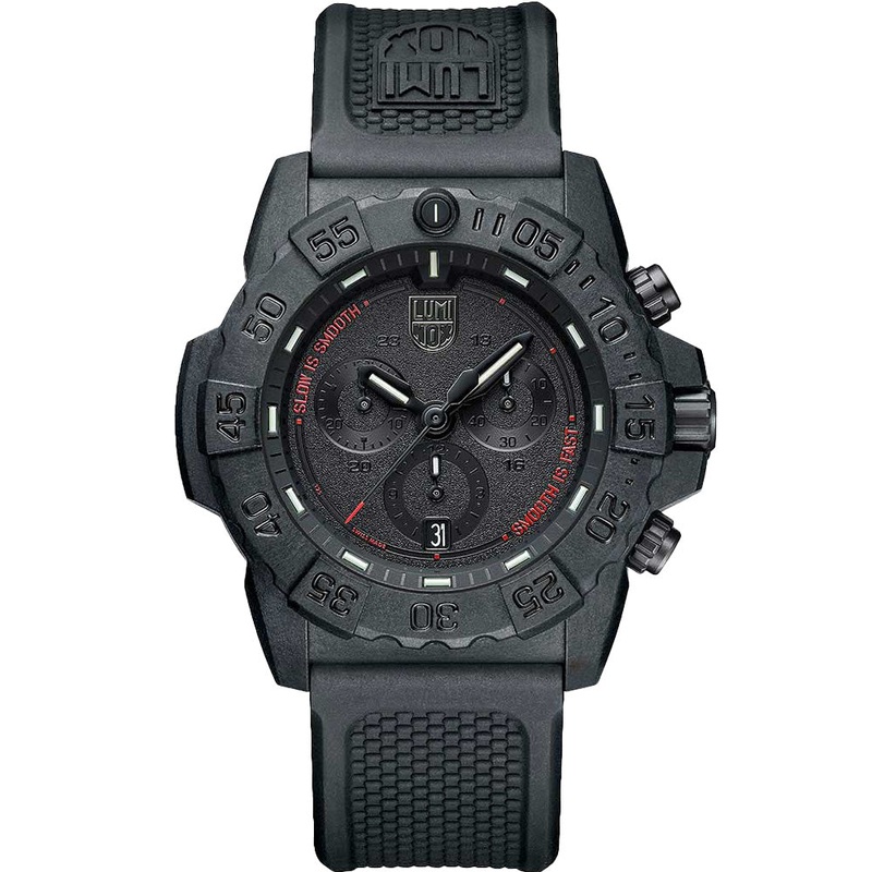 The Luminox Navy SEAL Chronograph with a black dial and rubber strap, model XS.3581.SIS, is a Swiss-made quartz diver’s watch. Key features include a Carbonox case, Swiss quartz movement powered by the Ronda 5030.D caliber, and a mineral crystal. It boasts an analogue display with chronograph function, 12/24-hour display, luminous hands and markers, and a date display. The watch is equipped with a unidirectional rotating bezel, screw-down crown, screwed case back, and buckle clasp. With a water resistance of 200m, it has an approximate case diameter of 45mm and a thickness of around 15mm.- Swiss Quartz- Chronograph- Approx 50 Months Battery Life – Unidirectional Rotating – Constant glow for up to 25 years- 45mm Case Size – Mineral Crystal – Carbonox Case – Rubber – Date Display – 200 Meters Water Resistant