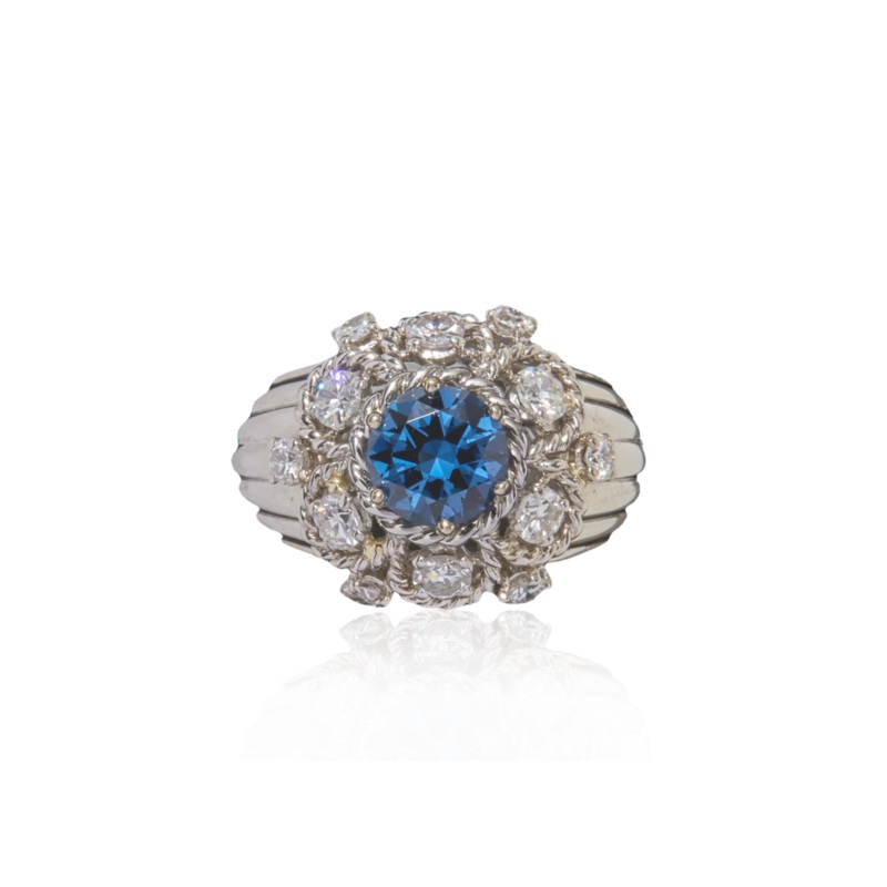 This signed blue spinel and diamond ring, designed post-1980s, is a stunning piece by the renowned maker Mauboussin. The ring features a centrally set round brilliant-cut blue spinel weighing approximately 1.55 carats with deep blue body color and excellent clarity. It’s surrounded by six larger diamonds and accented with six smaller ones totaling approximately 0.90 carat. The crown of the ring showcases an intricate twisted rope motif above a striated shank, all mounted in platinum with French hallmarks. This size 6 (US) ring can be resized to fit perfectly.