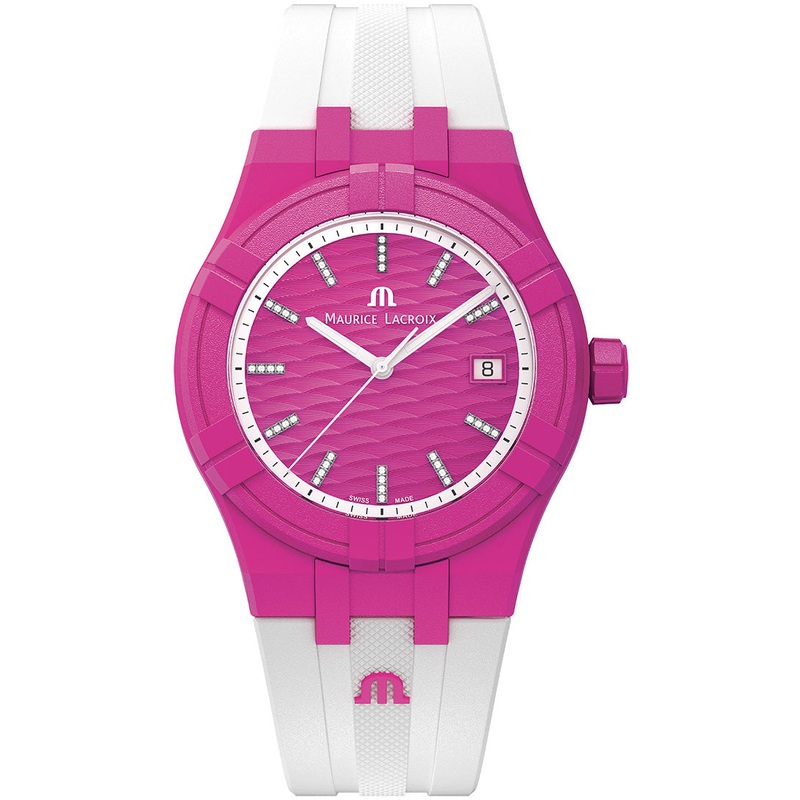 Maurice Lacroix Watch Aikon Quartz TIDE Dark Pink AI2008-FFFF1-3A0-0. Prepare to be dazzled! Maurice Lacroix unveils the brightest, funkiest range of watches, offered in an array of eye popping colours. The Maurice Lacroix AIKON #tide is made to be noticed. And, best of all, the AIKON #tide is helping to make the oceans a little bit cleaner, thanks to revolutionary technology that converts discarded plastic waste into Swiss quality watches. The AIKON #tide is cool with a conscience.