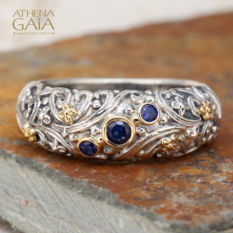 This listing is for a size 8 Meadow Breeze Stone Path Floral Band Ring with Dark Blue Zircon and a size 9.5 Meadow Breeze Stone Path Floral Band Ring with Rubies, as shown.