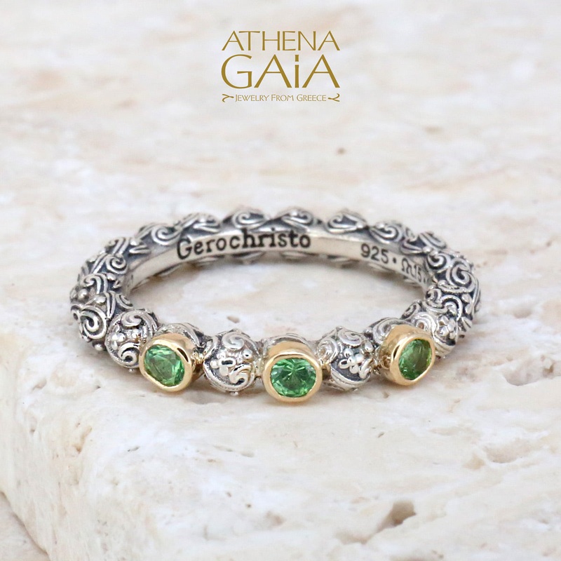 This ring has detail all around, with a solid 18k gold bezel surrounding each gemstone.It can not be resized without interrupting the 360 degree pattern.