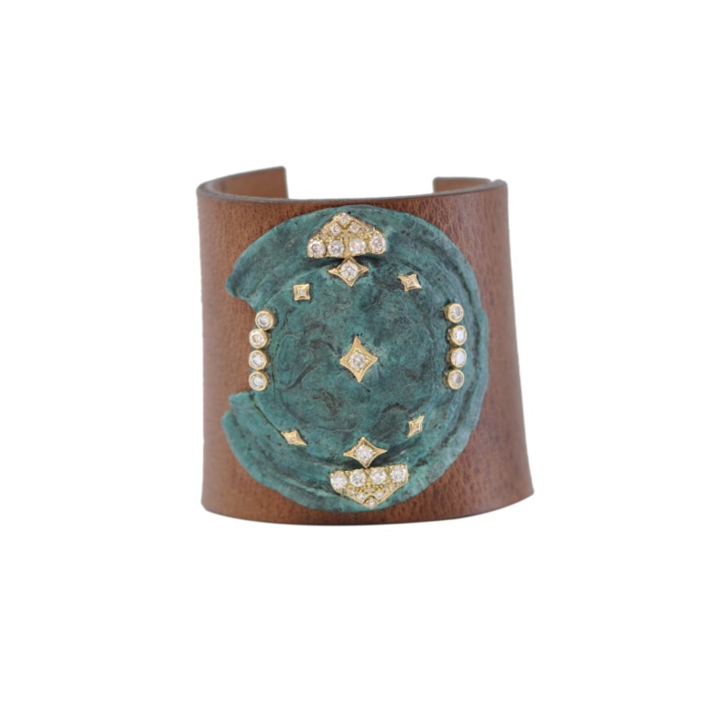 18k Yellow Gold and Blackened Sterling Silver Artifact wide leather cuff featuring medallion and Artifact chain closure in Teal Patina with crivelli and white diamonds.