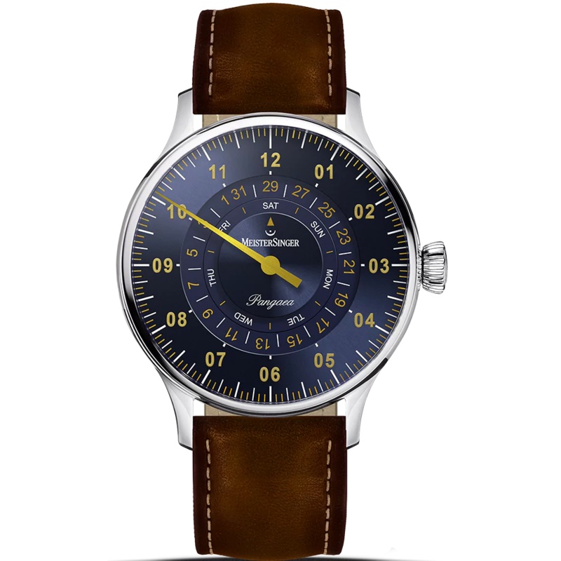 MeisterSinger Watch Pangaea Day Date Steel Blue With Gold PDD917G. Like the very first mechanical clocks, MeisterSinger watches display the time with just one single hand, literally summing up the entire experience by pointing to that one precious moment and thus conveying a reassuring sense of time. Superb design and outstanding Swiss watchmaking precision are combined to create watches that wont go out of style and may well be an inspiration for generations to come.