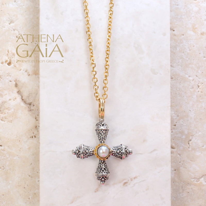 The Micro Prairie Stone Pomme Cross is crafted from 18k Gold and Sterling Silver. This exquisite piece features a center stone of your choice, which adds a touch of luxury. Perfect for baptisms, special events, or daily wear.