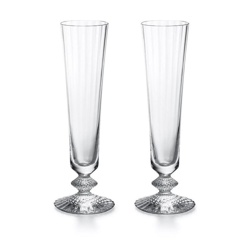 The elongated bowl and wide base are connected by an elegant diamond-cut piece of crystal the signature flourish of the Mille Nuits stemware which here doubles as the stout stem. Subtly alternating stripes travel the length of the slender bowl, gently refracting the light, and a striping pattern also irradiates around the glass’s thick base. Designed for Baccarat by Mathias, the name Mille Nuits is a reference to the 1001 Tales of The Arabian Nights, and to the world of the Orient. The Mille Nuits collection includes stemware, tableware and home dcor, ranging from decanters and plates to chandeliers and candelabras.