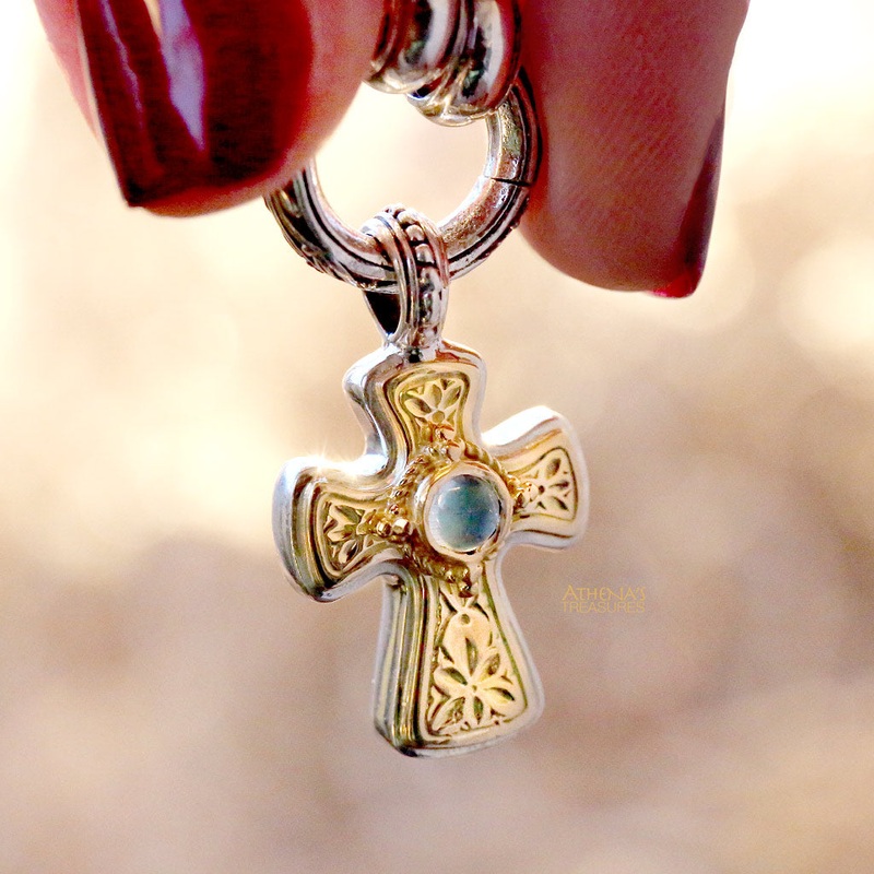 The Mini Flared Latin Cross is crafted with 18k gold and sterling silver. The cross features a stunning center stone. Perfect for baptisms, special events, or daily wear, it adds a touch of sophistication to any outfit.