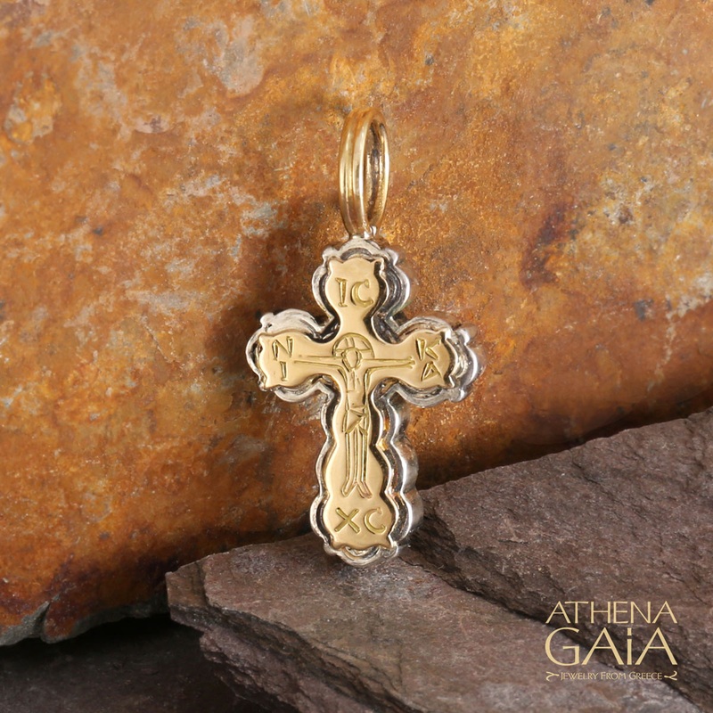 Gerochristo’s Mini ICXC Orthodox Cross has intricate etched design featuring Christ on the Cross, and exudes elegance and sophistication. Made with 18k gold and sterling silver, this cross is perfect for baptisms, special events, or daily wear.
