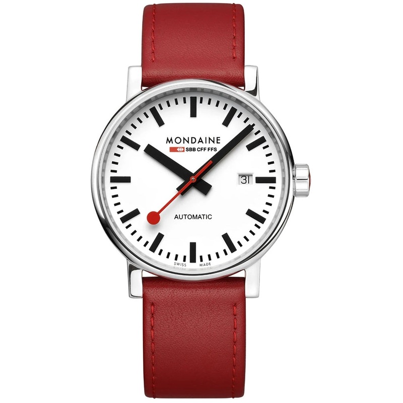 Mondaine Watch Evo2 40 Automatic MSE.40610.LC. For more than 100 years the Swiss Federal Railways have been famous for punctuality and precision. Historically the train station manager used a special red Paddle to announce to passengers and train conductors that the train is about to depart. This red Paddle with its special shape is also the second hand of the Official Swiss Railways Clock. Mondaines original and authentic watch and clock collection captures this pristine and punctual look.