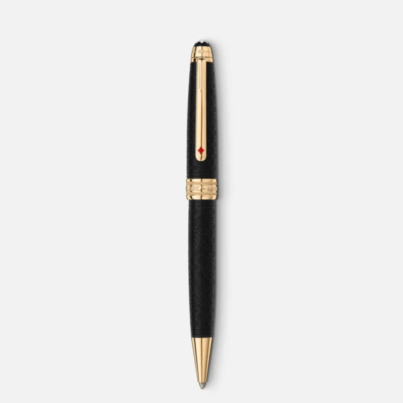The Meisterstck Around the World in 80 Days collection is inspired by the famous adventure novel by Jules Verne. The Solitaire Midsize Ballpoint in black stained wood, draws on the second leg of the journey from Bombay to Yokohama. Wood is chosen to pay tribute to when Mr. Fogg saves Princess Aouda from being forced to commit suttee. The main characters travel in this part of the adventure on a majestic elephant, which is featured in a cartouche on the cap. The cap and the barrel feature an engraved pattern that symbolizes good luck. The clip features a red lacquered diamond card suit, representing Mr. Fogg’s wager to make the journey in 80 days. The cap top is embossed with the length of the journey, 25 days from Bombay to Yokohama and 80 days in total.