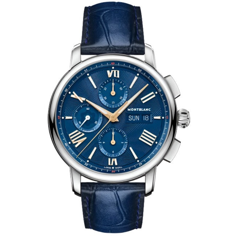 Montblanc Watch Star Legacy Chronograph Day Date Limited Edition 130973. The Montblanc Star Legacy Chronograph Day & Date Limited Edition of 800 pieces takes its inspiration from Minerva pocket watches from the late 19th and early 20th century with their round, polished, pebble-shaped cases and onion-shaped crowns. Its beautiful blue dial features Montblancs signature exploding star pattern along with rose gold-coated sword-shaped hands and numerals. It is powered by the automatic movement MB 25.07 that includes a chronograph, the day of the week, and the date. This timepiece is also fitted with an interchangeable blue calf leather strap with alligator print and tone-on-tone stitching.