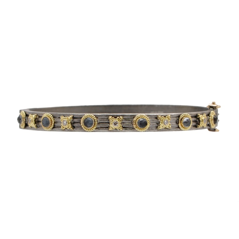 18K Yellow Gold and Grey Sterling Silver Huggie Bracelet with Diamond “X” and Round Hematite/White Quartz Stations with Champagne Diamonds (0.12 TCW)