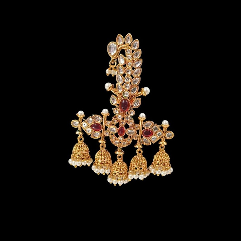 Add a majestic finishing touch to your traditional groom attire with the NAFJ Regal Spark Gold Plated Kundan Stone Brooch a luxurious accessory designed for Pheta, Saafa, or Kalangi styling. Meticulously crafted with sparkling crystal stones and a radiant gold-plated finish, this brooch exudes royal elegance and timeless charm, making it the perfect choice for weddings, receptions, and grand celebrations.