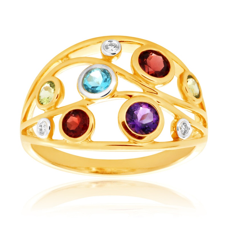 Diamond, Peridot, Blue Topaz, Garnet and Amethyst Ring. Please contact us regarding special order enquiries for this ring. All ring sizes can be specially ordered, with delivery approximately 6-8 weeks.