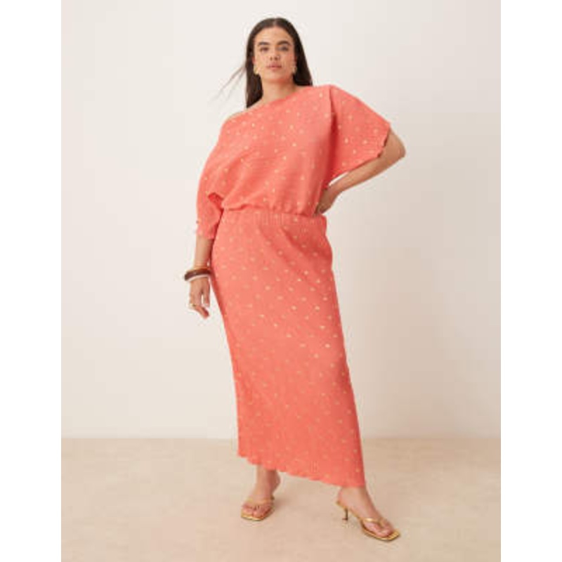 Find the best selection of Never Fully Dressed Plus Tilly off the shoulder plisse midaxi dress in coral and gold. Shop today with free delivery and returns (Ts&Cs apply) with ASOS!