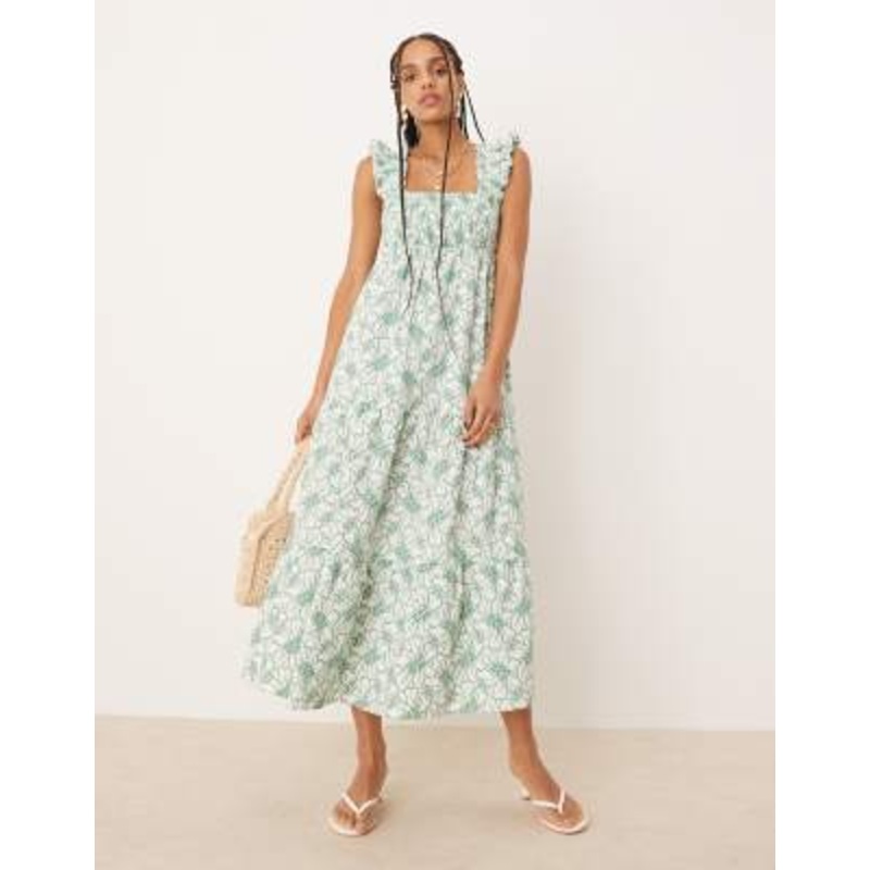 Shop the latest Nobody’s Child Maya ruffle shoulder tiered midi dress in green embroidery trends with ASOS! Free delivery and returns (Ts&Cs apply), order today!