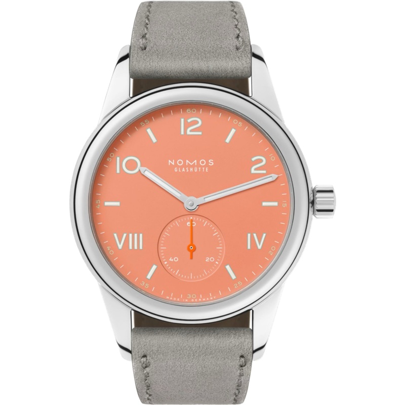 Nomos Glashutte Watch Club Campus Cream Coral 714. Because sometimes color is simply a must. And because this trendy coral tone is so beautifully eye-catching and fun to wear. Club Campus is youthful, free and uncomplicated, has a robust stainless steel case that is just 8.2 millimeters high, and remains water resistant to 10 atm. The hand-wound Alpha caliber from our own manufactory in Glashtte ticks away inside, finely decorated and adjusted in six positions, quality with protection of origin.
