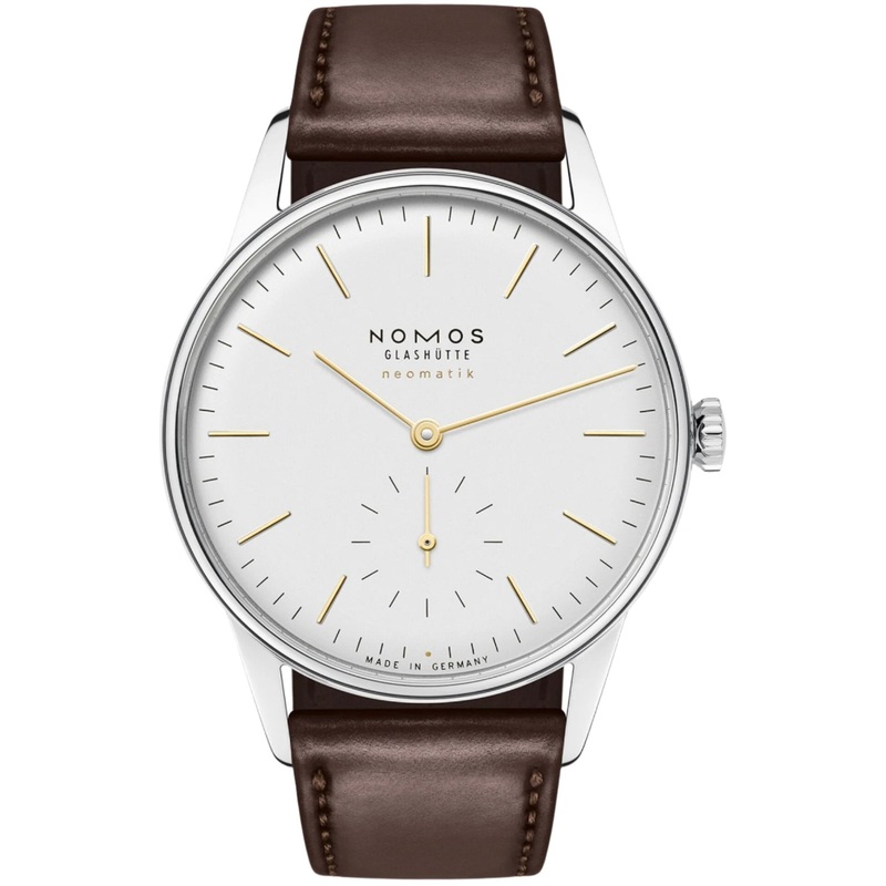 Nomos Glashutte Watch Orion Neomatik Dore 397. This watch makes you happy. With subtle gold accents, namely the golden hands and hour markers, Orion neomatik dor presents its wearer with a genuine and lasting elegance. The elegantly slender automatic dress watch in a stainless steel case with a perfect lenticular shape represents luxury in its most elevated form. Masterful mechanics from NOMOS Glashtte in a perfectly minimalist design, with a small but decisive touch of extravagance.