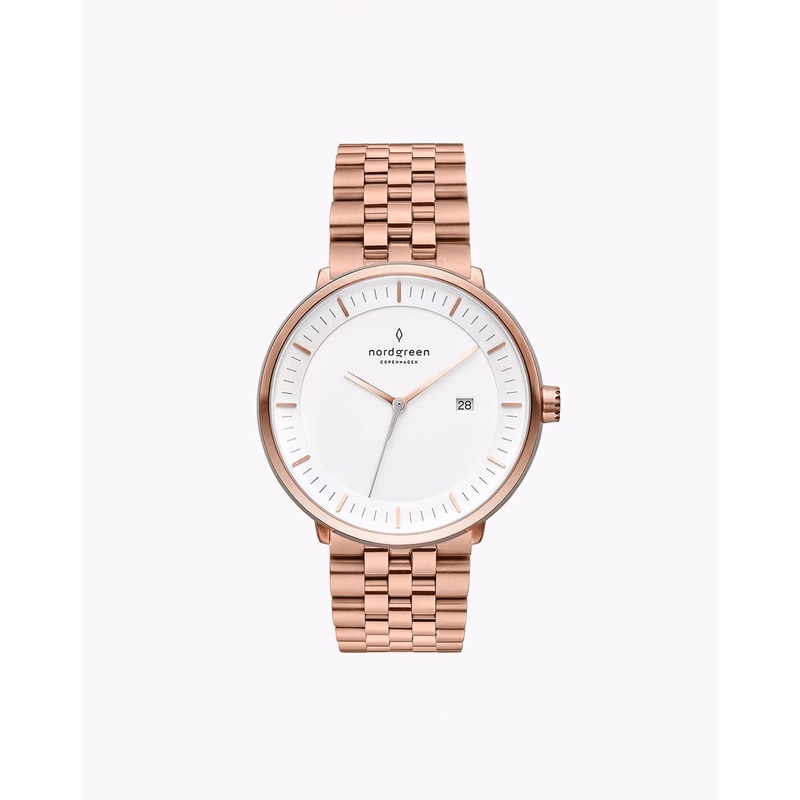 Introducing the Nordgreen Women’s Philosopher 36mm Rose Gold Watch, a stunning example of Danish design by Jakob Wagner that embodies elegance and sophistication. The two-piece white dial and asymmetric second hand create a unique aesthetic, making it a standout accessory for any occasion. Crafted with a 36mm rose gold case and a luxurious rose gold 5-link bracelet, this watch offers both style and comfort. The hardened mineral glass ensures durability, while the 3 ATM water resistance adds practicality to its beauty. Celebrate individuality and make a statement with this timeless piece, perfect for the modern woman who values both design and sustainability.