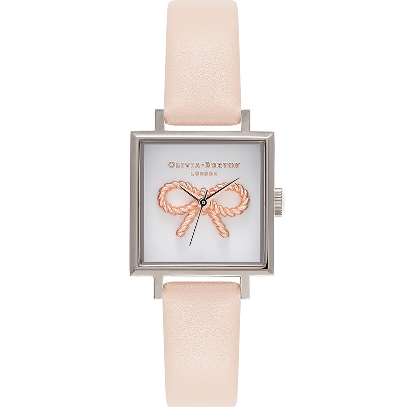Embrace the past with this elegant vintage-inspired watch from Olivia Burton. Featuring an eye-catching bow motif, a sporty soft pink leather band and a stylish square face, this timepiece is the perfect addition to anyones eclectic style. Features: