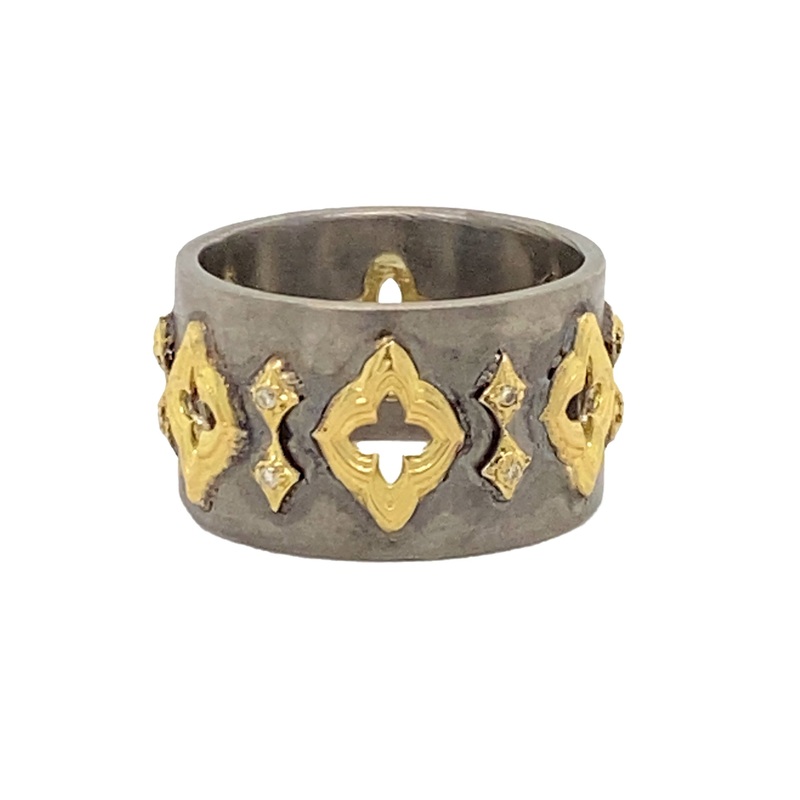 18K Yellow Gold and Grey Sterling Silver Open Scroll Wide Band Ring