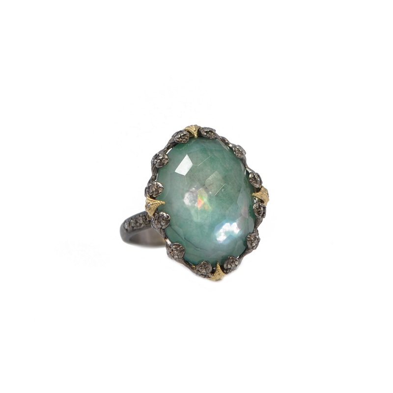 18k Yellow Gold and Grey Sterling Silver Ring with a 20x15mm Oval Emerald, 0.19 CT White Diamonds, and Crivellis.