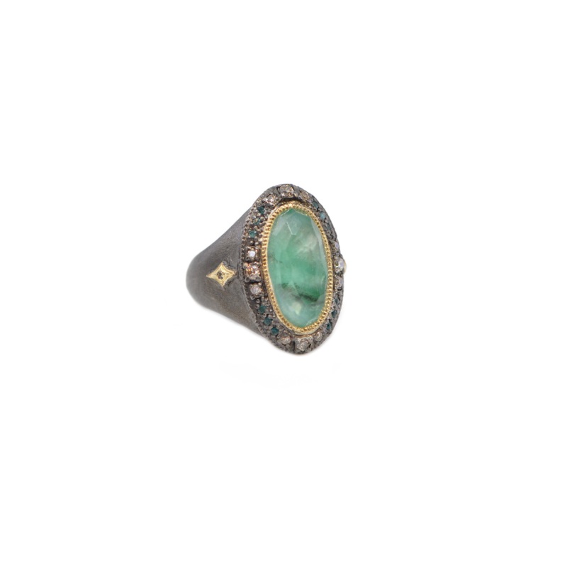 18k Yellow Gold and Grey Sterling Silver Cocktail Ring with a 16x8mm Oval Emerald,0.27 CT Champagne Diamonds, and Grandidierite.