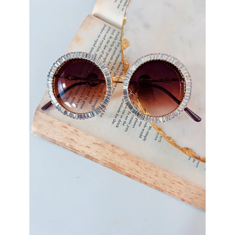 Made from gold tone metal and set with UV protected brown tinted lenses, our favourite Palma Sunglasses detailed with sparkling Swarovski around the whole round frame will specially flatter square and oval face shapes.