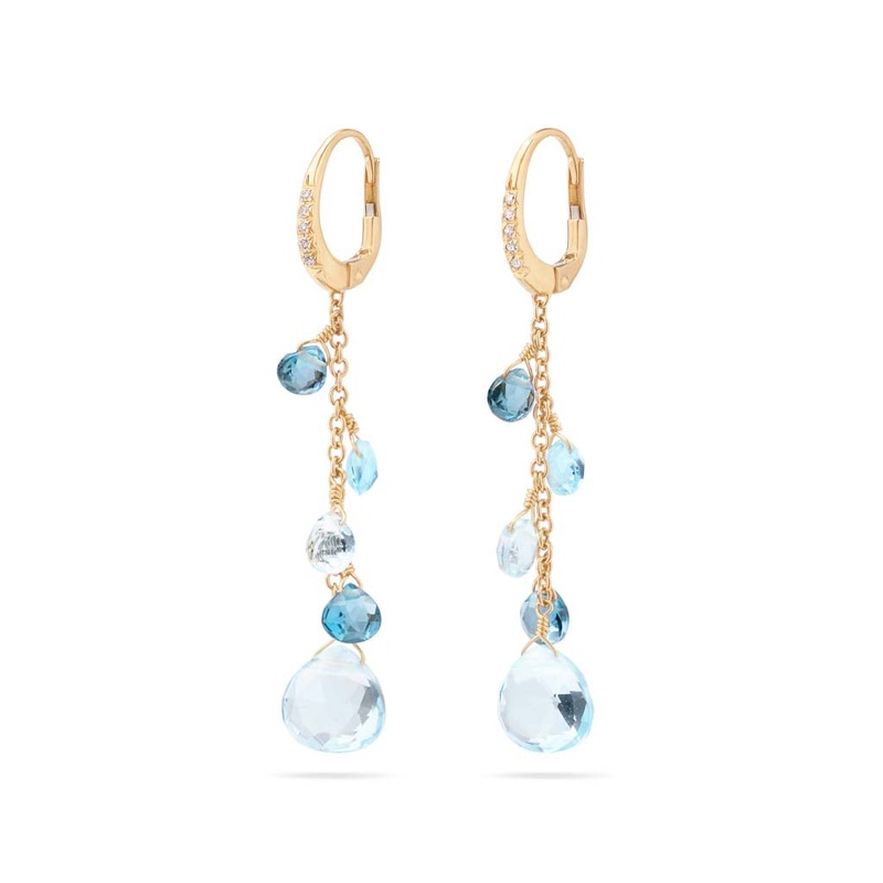 These 18K yellow gold pendant earrings are embellished by a precious clip back closure with brilliant-cut diamonds and a cascade of finely selected heart-cut topazes that enrich the jewel with their intense colours. The 18K yellow gold nuggets are finely hand-engraved using the ancient Florentine technique