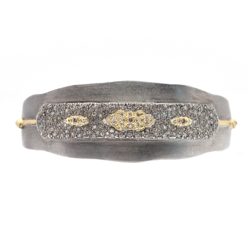 18K Yellow Gold and Grey Sterling Silver Wide Pave Scroll Kick Cuff Bracelet with ChampagneBrilliant-cut Diamonds. (1.06 TCW)