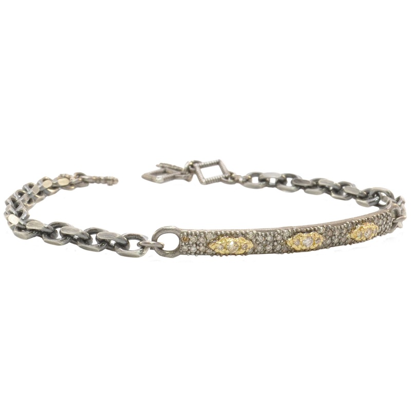 Sterling Silver ID Bracelet with 18k Yellow Gold Scrolls and Pave Champagne Diamonds. Adjustable at 7″ and 7.5″. (.03 TCW)