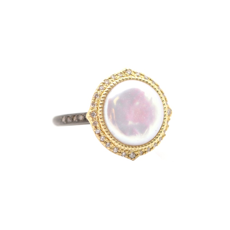 18K Yellow Gold and Blackened Sterling Silver 12MM Round Coin Ring with White Freshwater, Cultured Pearls, White Diamonds and Champagne Diamonds. (0.2 TCW)