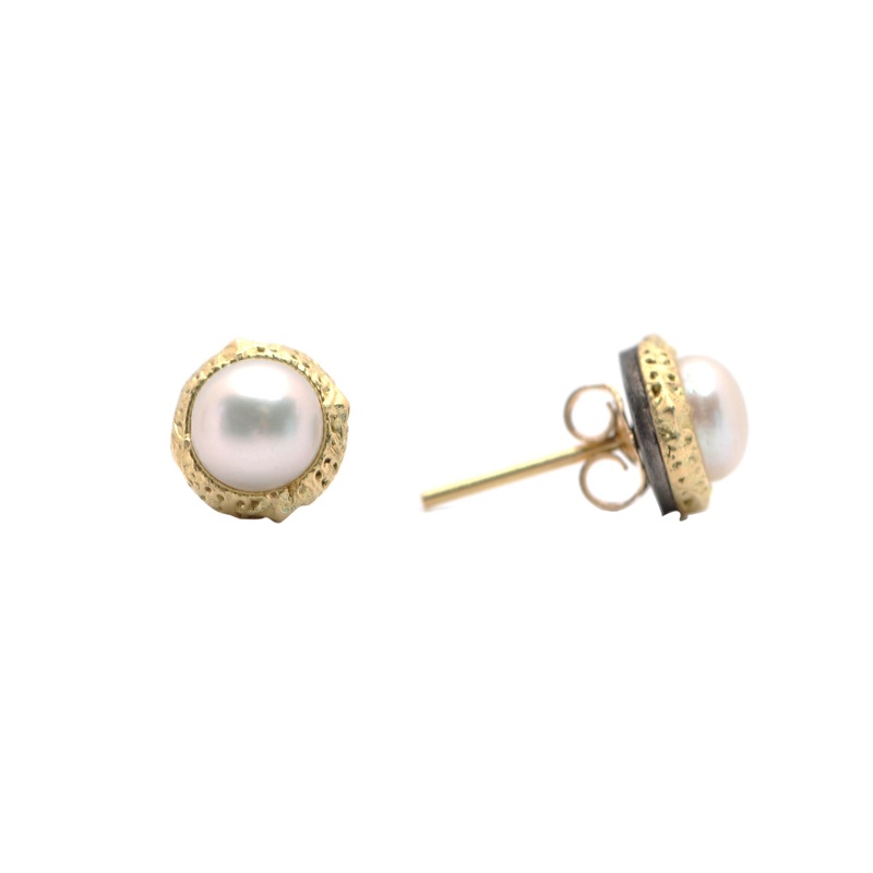 18K Yellow Gold and Blackened Sterling Silver 6.5MM Carved Stud Earring with White Freshwater, Cultured Pearls