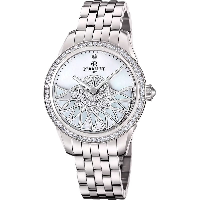 Perrelet Cleopatra Perle du Nile Diamond Watch A2072/1. Inspired by the legendary queen of Egypt, this 36.5 mm titanium timepiece combines elegance and innovation. Its bezel set with 64 brilliant-cut diamonds frames a radiant white mother-of-pearl dial, highlighted by a solitaire diamond at 12 oclock. At its centre, Perrelets iconic Double Rotor, shaped as a delicate fan and adorned with 30 diamonds and nacre inlays, comes alive with each wrist movement. Powered by the in-house calibre P-181-H with 26 jewels and 42 hours of power reserve, it showcases fine finishes such as Ctes de Genve bridges and a circular-grained mainplate. The polished-satin titanium bracelet with quick-release system, interchangeable with a matching leather strap, adds refined versatility.