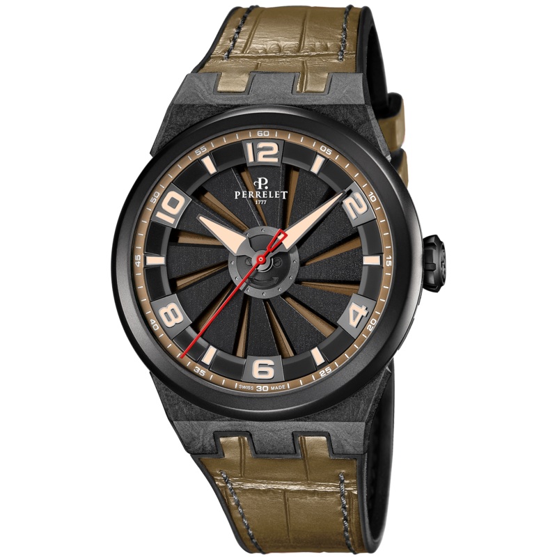 Perrelet Watch Turbine Carbon Khaki A4065/8. The Turbine Carbon Khaki is the perfect balance between discretion and presence. Its characteristic turbine mounted on a khaki subdial offers a less conventional and more earthy design, ideal for lovers of the classic who do not compromise on modernity. The robust and lightweight case of this watch is designed to accompany both everyday activities and more demanding adventures. The calfskin strap with khaki detailing reflects a commitment to comfort and style, ensuring that this watch is both a practical companion and a distinctive accessory.