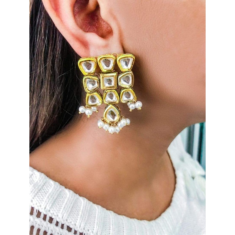 Handmade in-house meticulously with attention to the tiniest of details, our kundan Persia Earrings inspired by geometric architectural design give out a dainty feel thanks to its delicate pearl drops.