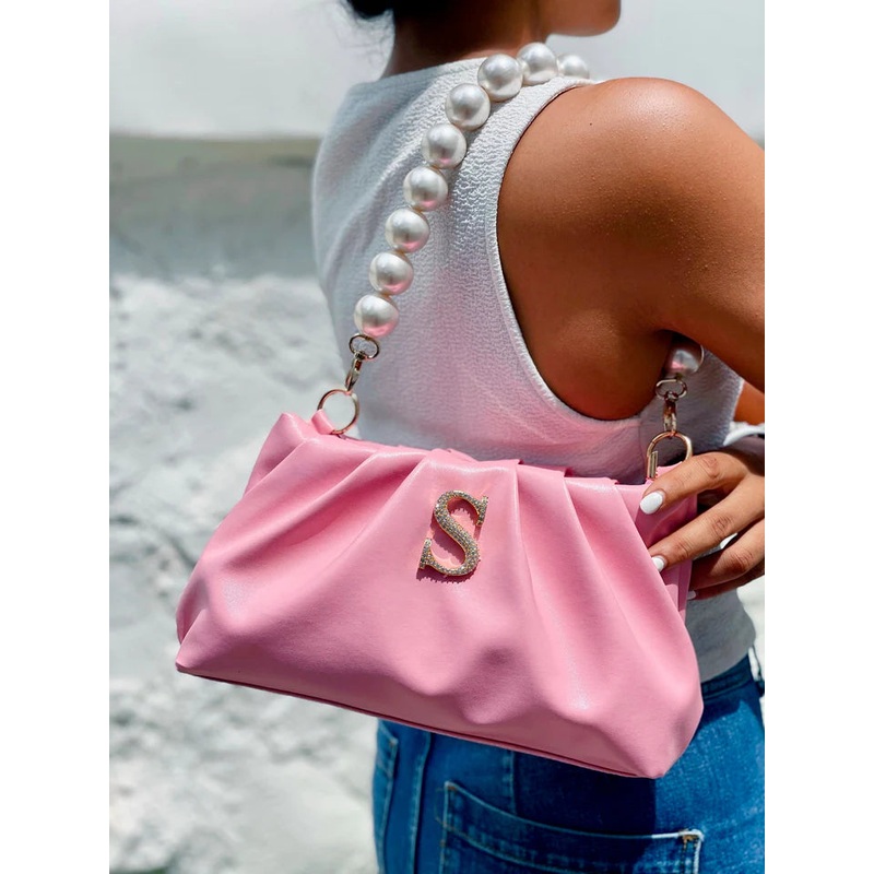 The Alphabeto Rouched BagCotton Candy is every girls dream come true! Perfectly sized to fit all your essentials, with detachable pearl, this bespoke bag is everything you've been waiting for. Wear it like a purse or a clutch, this versatile bag is all you