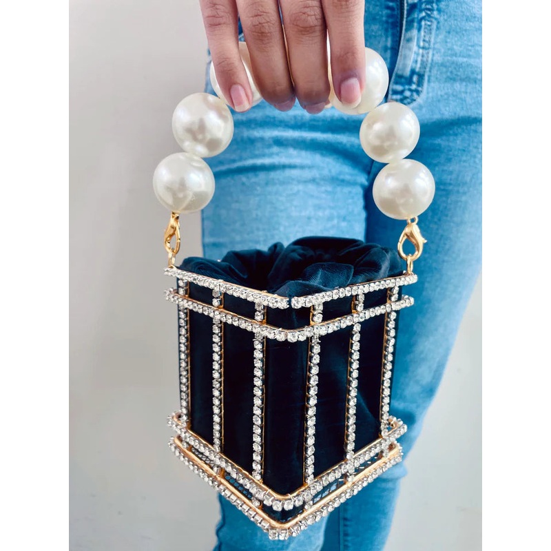 Handcrafted with scintillating Swarovski crystals & pearls this one is a game changer. Finished with a luxe velvet pouch on the inside, you could hold the bag with its classic round handle or go a little extrawith the long chain strap!