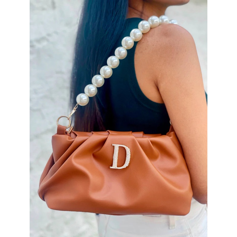The Alphabeto Rouched BagTan is every girls dream come true! Perfectly sized to fit all your essentials, with detachable pearl, this bespoke bag is everything you’ve been waiting for. Wear it like a purse or a clutch, this versatile bag is all you need to make a statement!