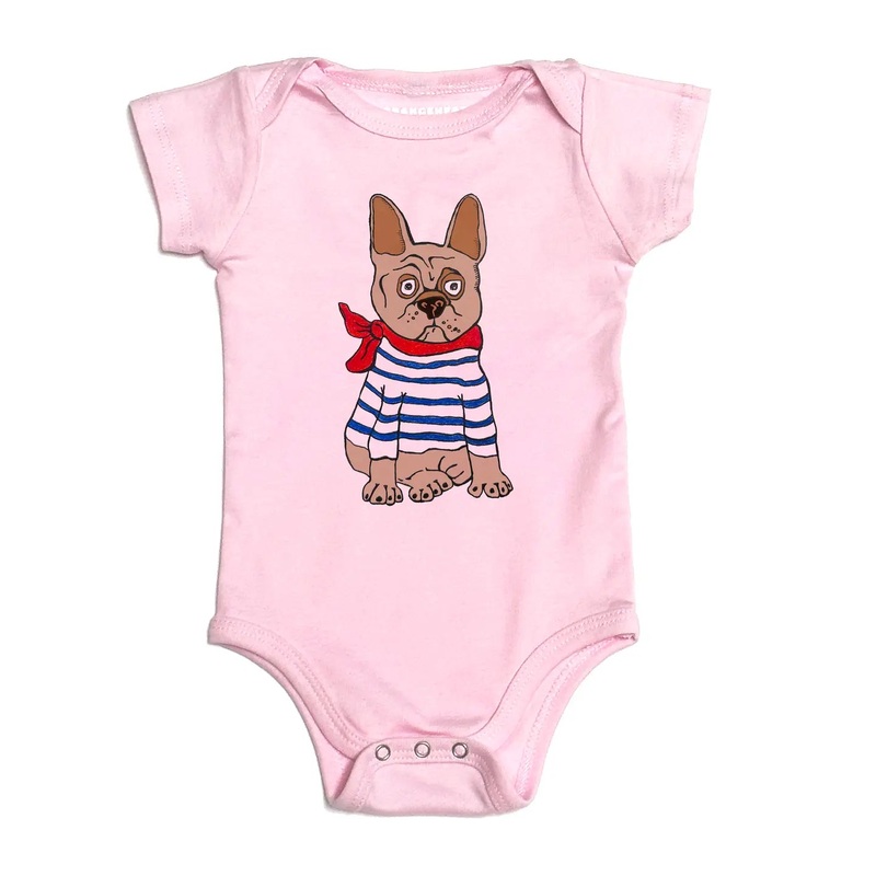 Frenchie doggie on pink cotton 100% cotton. Pink Soft and comfy tag less apparel. Designed in Venice California.