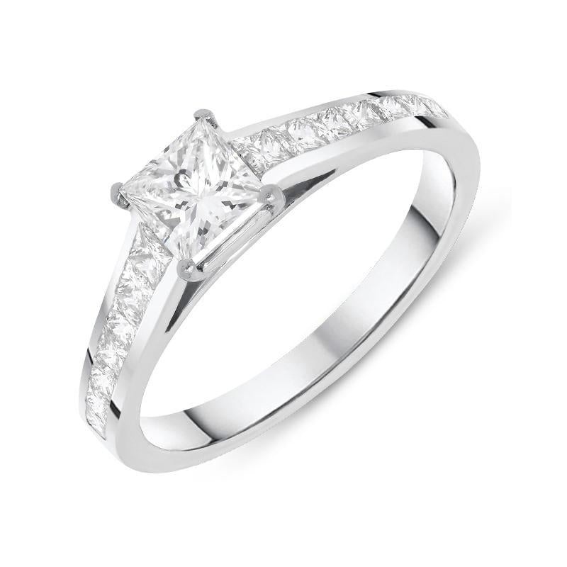 An embodiment of elegance, this luxurious platinum ring features a central princesscut diamond which is claw set, allowing the maximum amount of light to travel through the stones and accentuating the sparkle. The precious gemstones, totalling 0.50cts, cascade down the shoulders of the ring, adding extra opulence to the piece. Designed perfectly for everyday wear, this diamond set piece would make the perfect engagement ring to sit comfortably alongside a wedding band.